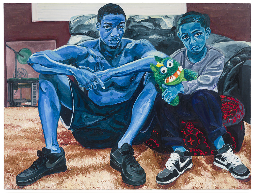 I like how detail oriented her work is and I can relate to that. The small details like the Nike swoosh on the boys' shoes and the tattoos on the older male's chest really caught my eye. I also really love the style this painting is done in. The figures are quite realistic, but their skin tone is very unnatural and I find this to be very intriguing. The blue skin tone and the expression on their faces gives this piece a somewhat upsetting vibe. The direct eye contact between the figures and the viewer also gives off a sense of disappointment. My favorite part of the piece is the little monster that the boy is holding. I love how Jordan captured the texture of the monster's fur as well as the texture of the carpet.